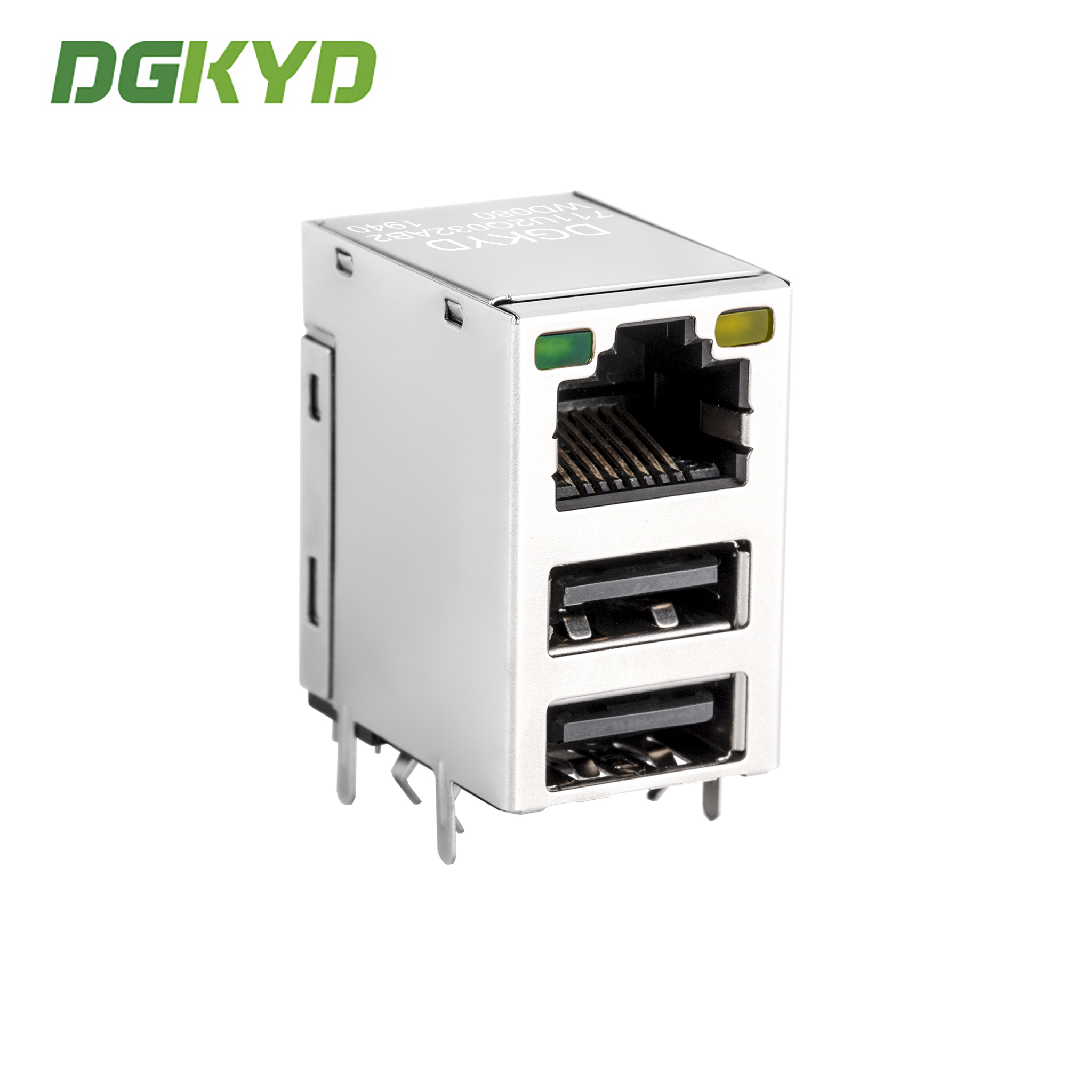 RJ45 connector with dual USB 2.0 sockets featuring Gigabit network interface with metal shielding. Part Number: DGKYD711U2Q032AB2WD080